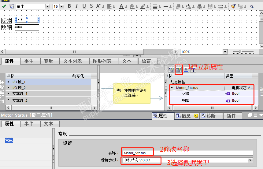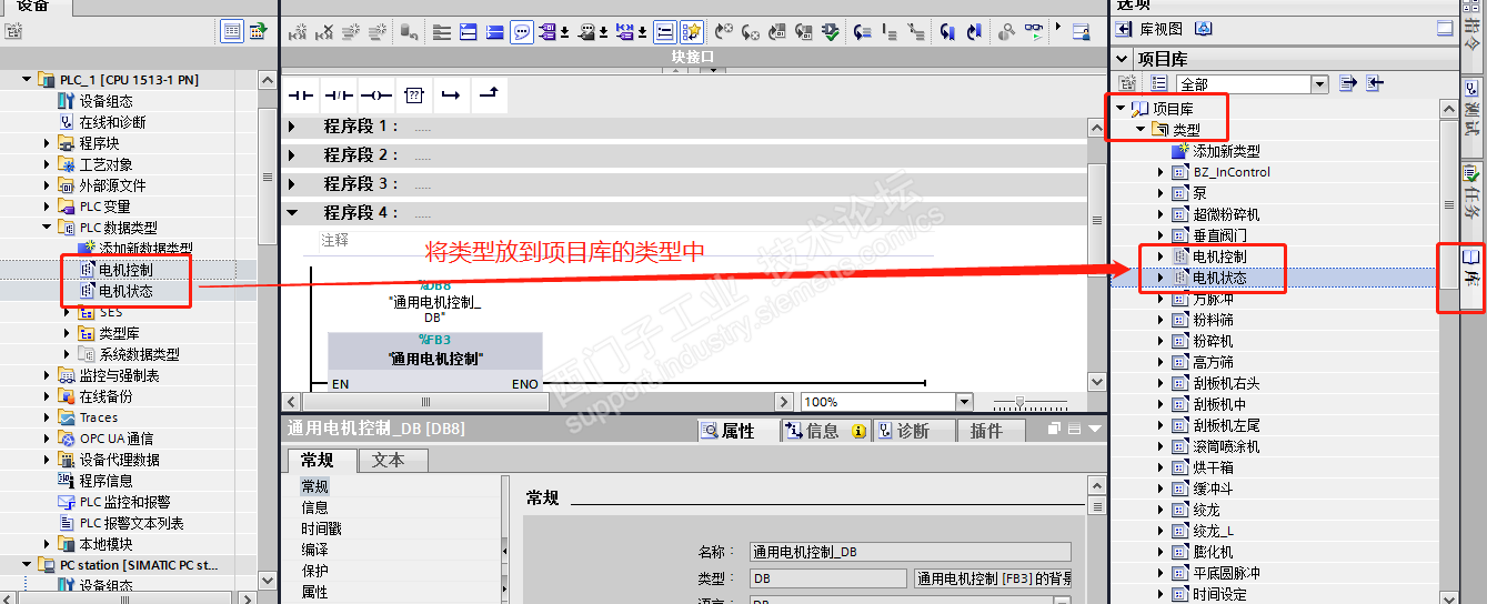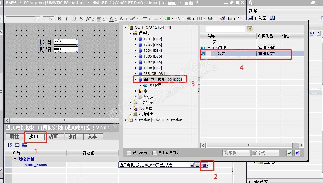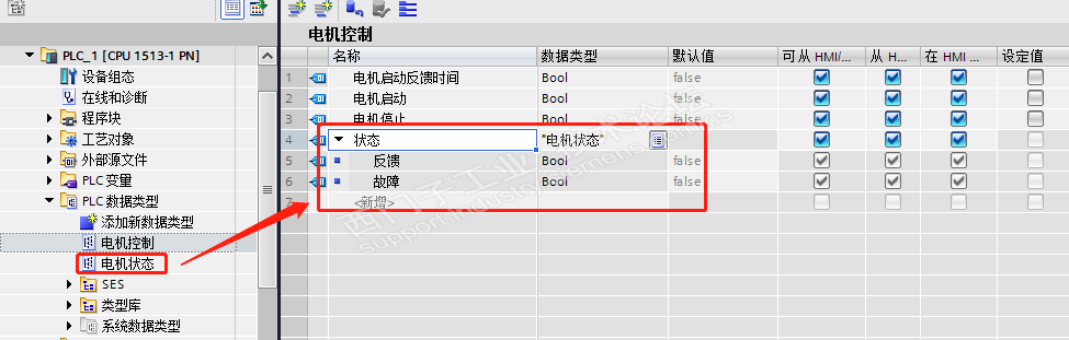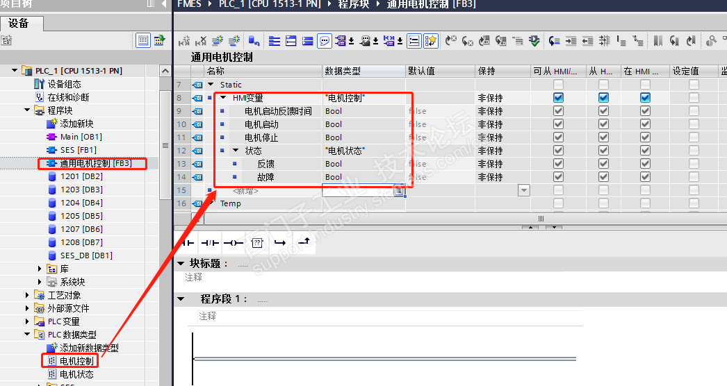 二、建立电机FB功能块:通用电机控制。在静态变量添加变量 HMI变量