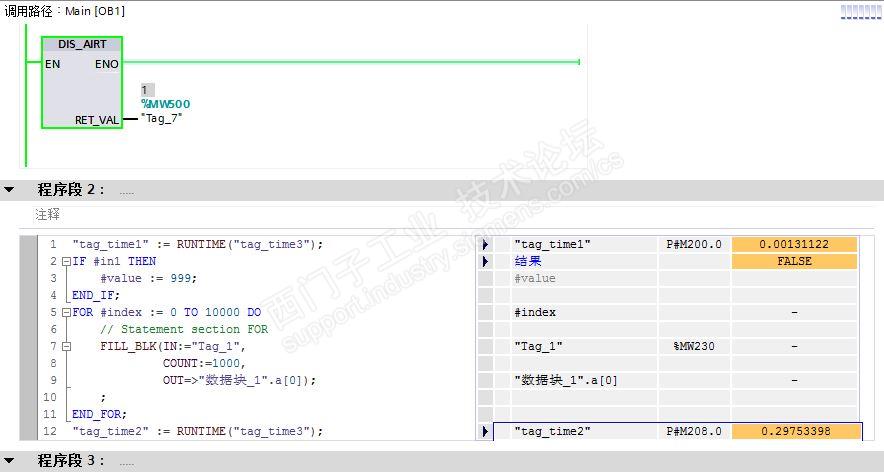 测试结果,如果M3.1为假,不调用FB1块,MW100会按PUT指令写入的值改变,如果调用FB1块,PUT指令写入时数据改变时间大概率会落入延时0.3秒这段程序,因MW100传入的接口是INOUT类型,造成MW100的值保持在调用FB1时的值而不改变。