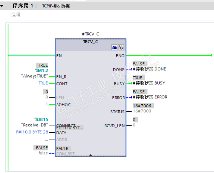 用TCP助手做客户机每隔100ms发送一次数据。S7-1200PLC接收端使用不定长接收(引脚ADHOC=1).产生的问题:发送间隔100ms时,PLC端有时会将2次接收的数据合并成1条。 发送间隔200ms时,PLC端逐条接收,