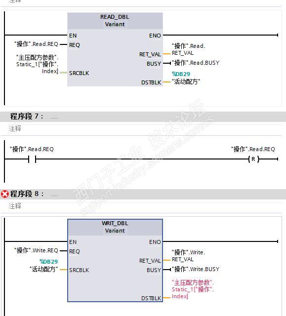 分配无效:实参中的组件与形参中的组件DSTBLK(VARIANT)不同,具体如图所示,程序我是安装官方教程-配方功能快速入门编写的http://www.ad.siemens.com.cn/productportal/Prods/S7-1200_PLC_EASY_PLUS/08-Function/14-Recipes/02-Getting_start.html,具体如图所示,现在也可以正常下载到PLC并能正常运行,但不能仿真运行!