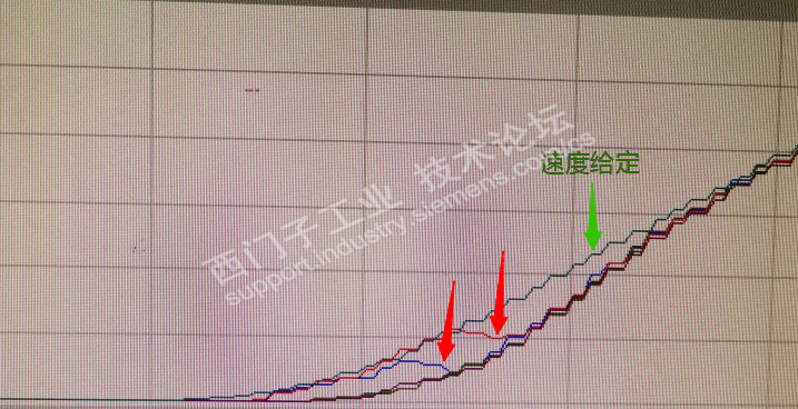 如图,蓝色和红色的曲线,是两个电机的实际速度。上面绿色是速度给定。