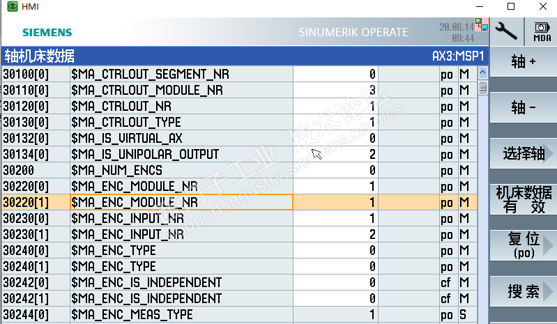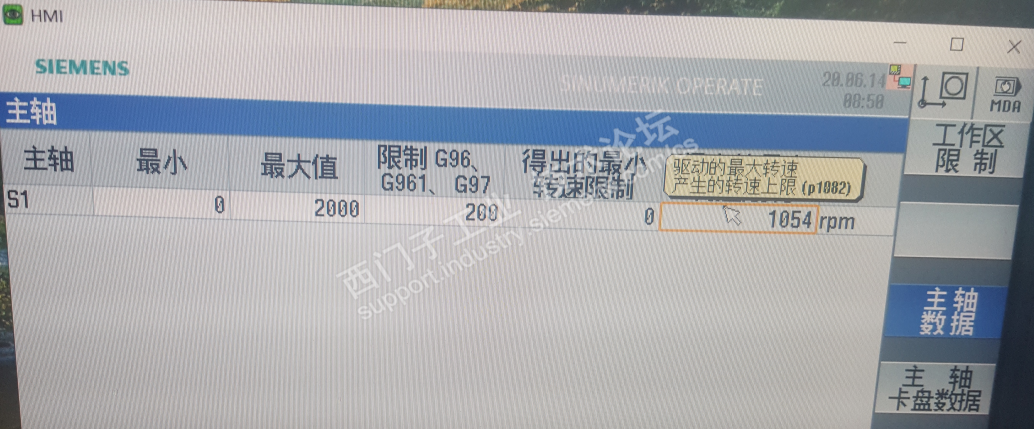 828D配置了模拟主轴,但主轴转速被限制在1054 rpm。查看参数区域的主轴,能看到是P1082参数限制了转速到1054,通过NC变量$AC_SMAXVELO [0]查到结果为10,查找10的含义,也是P1082。