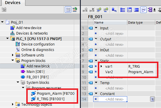 R_TRIG和Program_Alarm是两个FB的名字。其功能可以在帮助文档里面搜索。