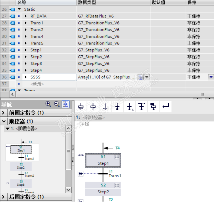TIA GRAPH增加步时默认生成静态变量Step1,自己也可以建静态变量组,但也步如何使用自己定义的步。见图: