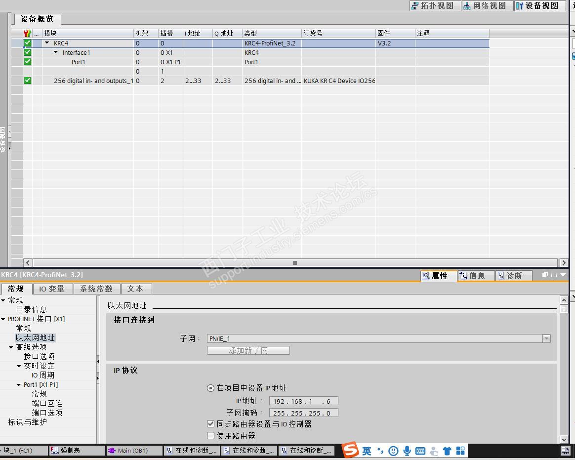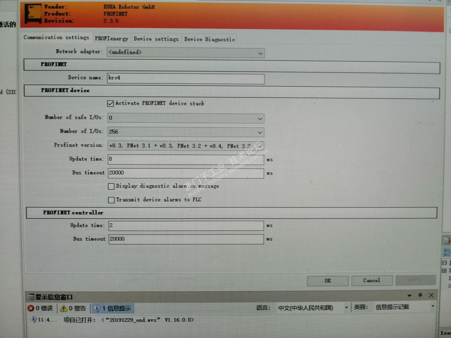 这种错误表示PLC没有连上KUKA机器人,我首先检查了KUKA端的配置,通过的是PROFINET连接,所以打开workvisual软件,查看通讯配置一栏,设备名称,I/O点数量,以及更新时间延时等参数。