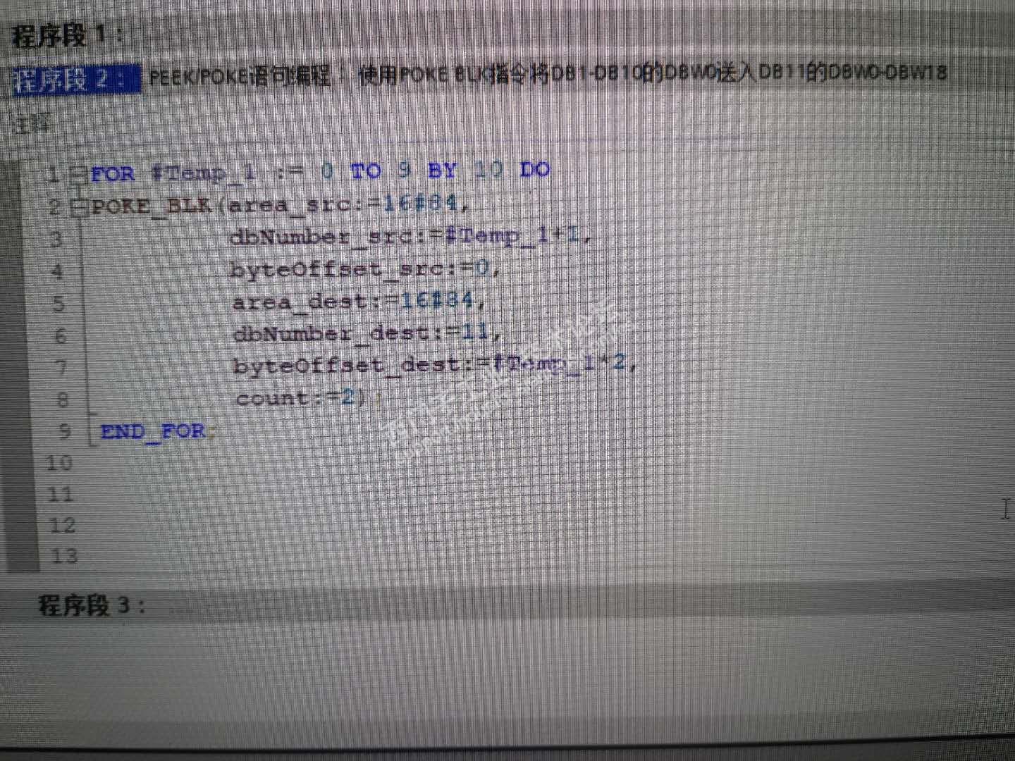 PEEK/POKE语句编程: 使用POKE BLK指令将DB1-DB10的DBW0送入DB11的DBW0-DBW18。