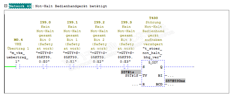 在上图可以看到只要M0.4=1,且83A1没有输出,才会引起手轮触发报警,根据实验和现场查看,在按下急停后M0.4=0,虽然83A1没有输出,但是也不会报警手轮HT8急停触发,而我们确实也没有按下手轮HT8的报警。