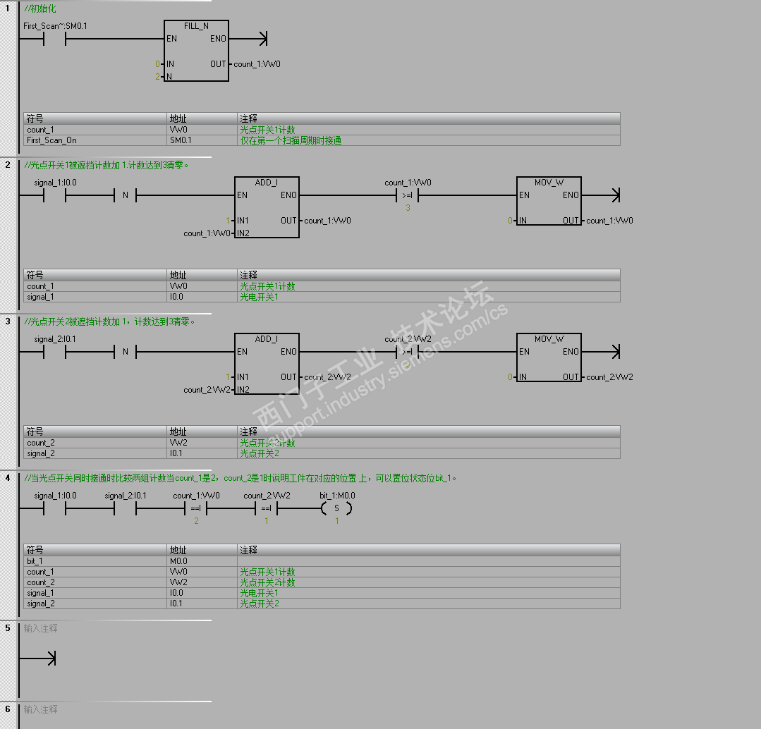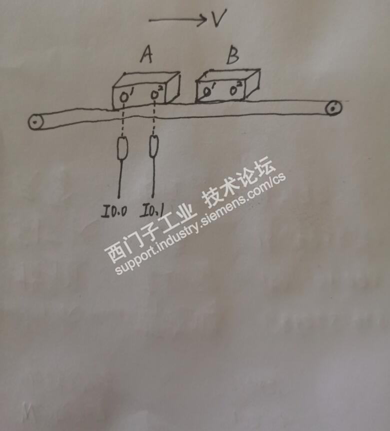 可以看到一个物体完整的从光点开关走完需要被每个光点开关触发3次。而刚好在我们希望看到的位置时(如图),i0.0被触发了2次 ,i0.1被触发了一次。所以我们以光点开关被触发的次数来做位置分析。下面我按照自己的思路写了一段程序。还有就是光点开关误动作的情况貌似这个思路下不好处理。