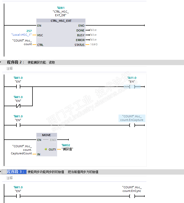 18.S7-1200高速计数器计数模式的功能:a.组态I0.0为单相脉冲输入点;b.组态I0.1为硬件门输入,信号电平设置为高电平有效,不调用高速计数器指令。观察I0.1导通或断开时,高速计数器是否计数;c.组态I0.2为捕捉输入,启动条件设置为上升沿有效,调用高速计数器指令,使能HSC_Count.EnCapture。观察I0.2导通或断开时,HSC_Count.CapturedCount的值的变化;d.组态I0.3为同步输入,信号电平设置为高电平有效,调用高速计数器指令,使能HSC_Count.En_Sync。观察I0.3导通或断开时,当前值的变化;f.设置初始参考值2等于20,计数事件设置为"参考计数2 (加计数)",脉冲输出的周期事件设置为:500ms,输出的脉冲宽度为100%,组态Q0.0为比较输出