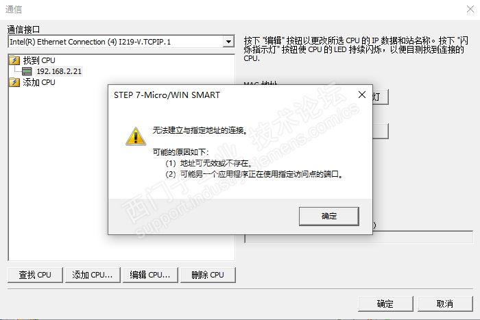 Win10专业版操作系统,STEP 7-MicroWIN SMART V2.5软件。通讯中可以搜到CPU,连接CPU的时候报错,错误信息见图。