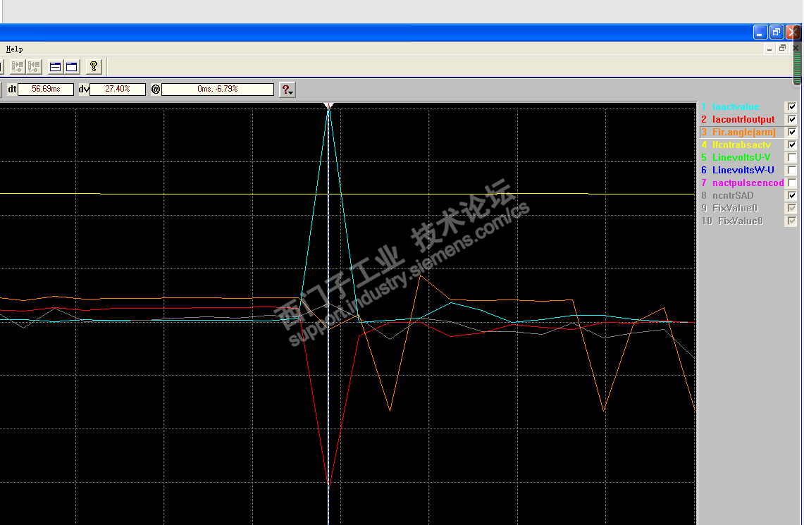 看了论坛上的《6RA70传动装置正反桥切换过程分析》,我就觉得我之前的分析不对。 今天又看了波形,脉冲电流的瞬间, 触发角-6.79%, 也就是96.11度, 此时确实是逆变。而且不是本桥逆变,是反组投入了逆变。 不知分析的是否正确?