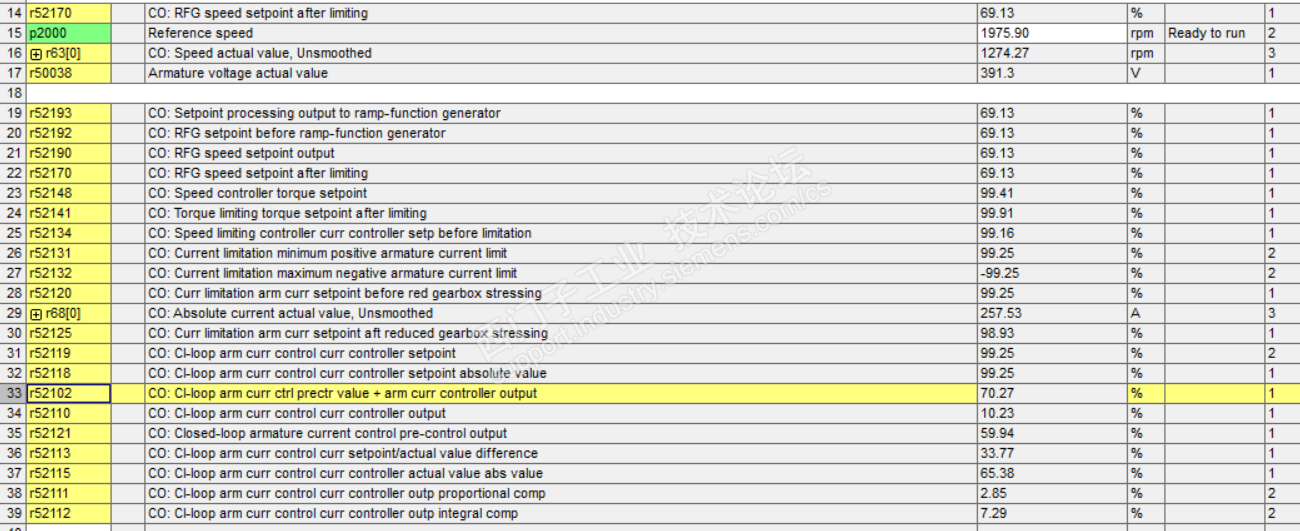 最高速1976,给定69.13%=1366转(DP通讯给定,没有干扰因素)。反馈1274转,没有达速,关键是电流也只有257A不再上升。查电流调节器前给定r52118=99.25%,但电流调节器的输出r52102只有70.27%,这是什么原因呢?