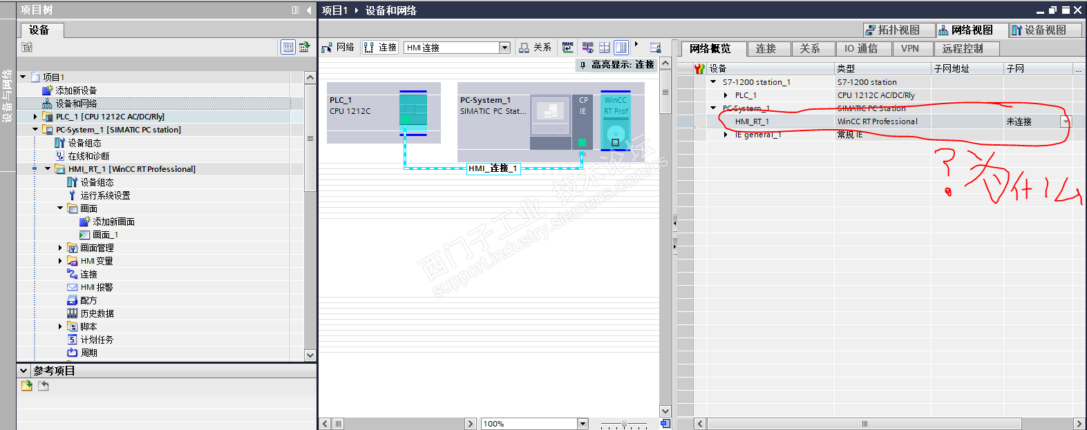 项目组态一个1200PLC,TIA WinCC Professional容器和通讯卡 PLC建立两个内部变量MW0/MW2 TIA WinCC Professional建立一个画面,显示两个内存变量,项目编译没有报错 仿真PLC和TIA WinCC Professional,画面数据显示感叹号 请哪位大神指点一下,困扰小白好久了,不胜感激