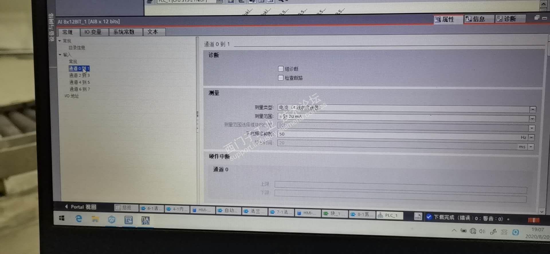 用西门子315C-2PN+两个模拟量输入模块331-7KF02-0ABO模块,配置为四线制4-20mA输入,接线是按照接线图上的将2接模拟量输入信号正,3+10+11接模拟量输入负同时和0V短接,组态配置选择四线制4-20mA,配置完成后下载到PLC仍然报错,求助大神帮忙
