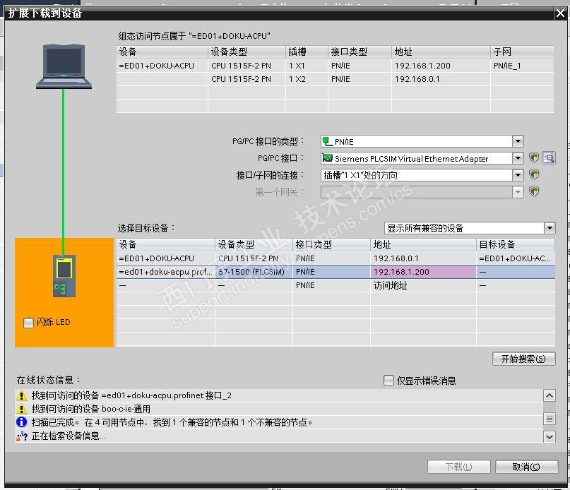 1、V15.1和SIM ADV装在同一个虚拟机里面,Online Access启用,设置PLC名称及IP地址,系统能PING通SIM PLC的IP。可是在V15.1下载的时候,PLC IP地址显示红色。昨天整了半天,突然可以下了,也不知道红色IP地址怎么好的。可是今天又预到这个问题,如图,特此请教
