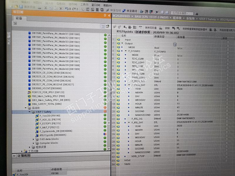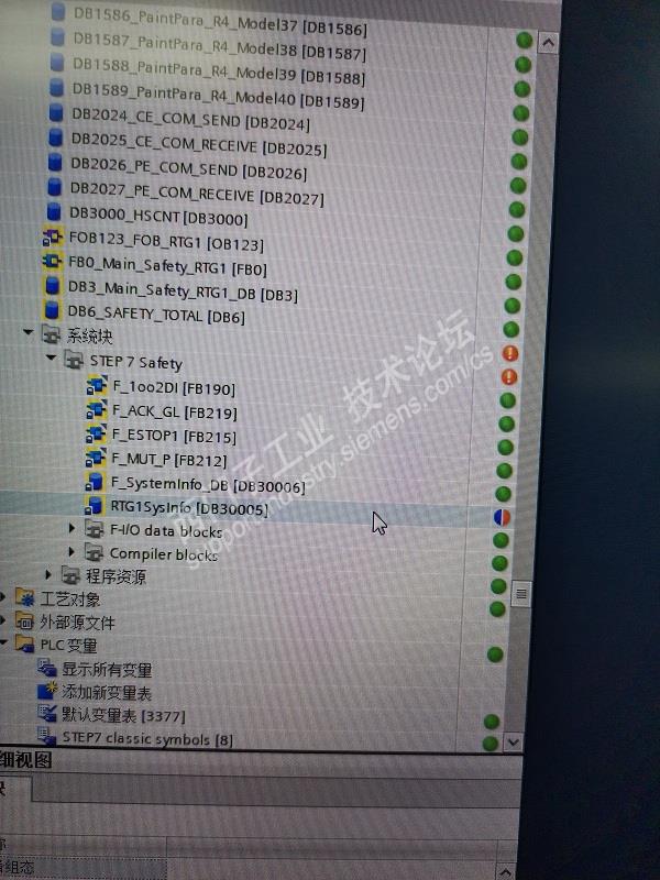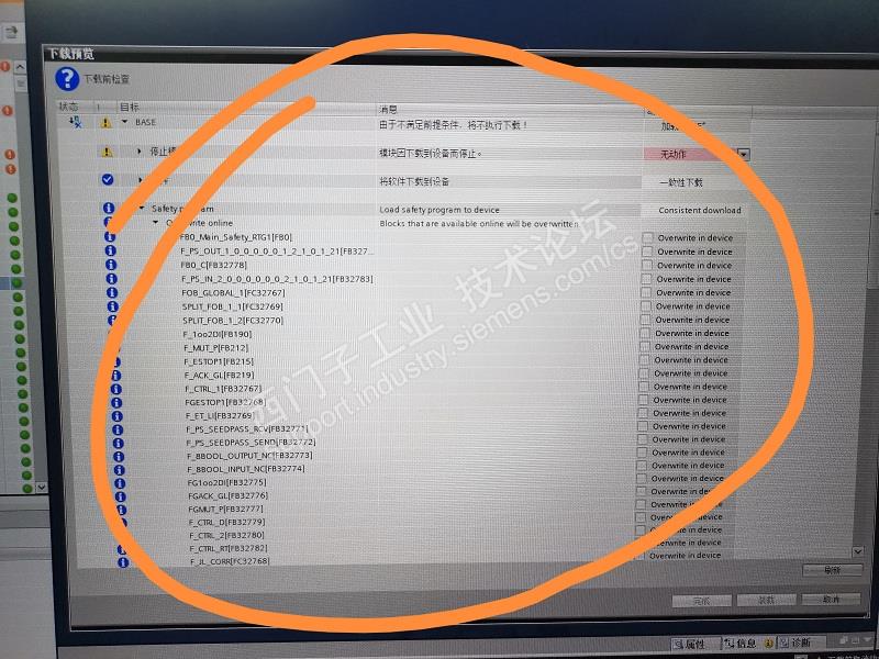 情景: 一个汽车项目厂家是使用1517F做到,由于设备故障,需要改动一个FC块的一个常闭点,当时在生产中,修改后就下载,谁知道却提示条件不满足,需要停止模块,如图1 可是在生产中,不能影响生产停线,所以就不下载了,因心想也许有人把离线程序修改了,于是就把现场plc上传过来("将设备做为新站上传"),监控比对无误,就在该最新程序中该了一个常闭点,可是去下载又提示和原来一样:需要停止模块,并要求下载系统安全块,