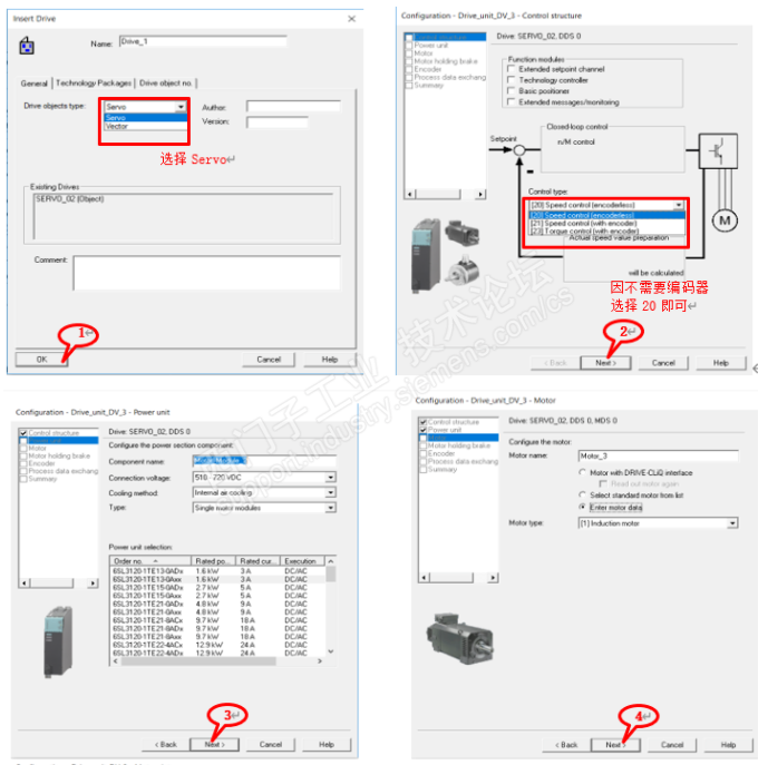 因驱动轴实际连接的负载并不是电机而为电容或电池,所以在项目配置时需创建虚拟电机,以6SL3120-1TE13-0AA4单轴电机模块为例配置项目如图2-4