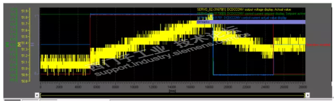 负载为超级电容,电流控制模式下电容充放电过程,运行实测trace曲线如图2-5,r31697.1(电压实际值)黄色曲线, r31700.0(电流给定值)绿色曲线, r31701(电流实际值)蓝色曲线,r899.2(状态字操作使能)红色曲线。通过trace曲线可知电流给定为3A时,直流母线给电容充电,电容电压升高;电流给定为-3A时电容放电给直流母线充电,电容电压降低。