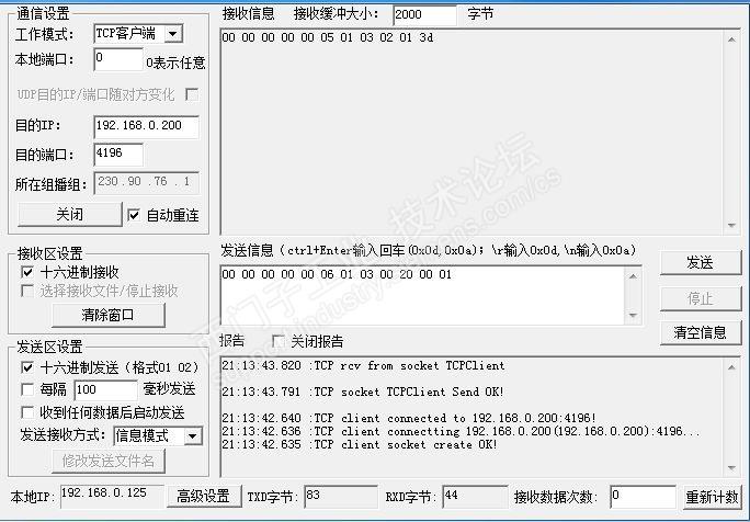 PC使用TCP调试工具也正常读取:(读RTU设备保持寄存器 地址 20H )