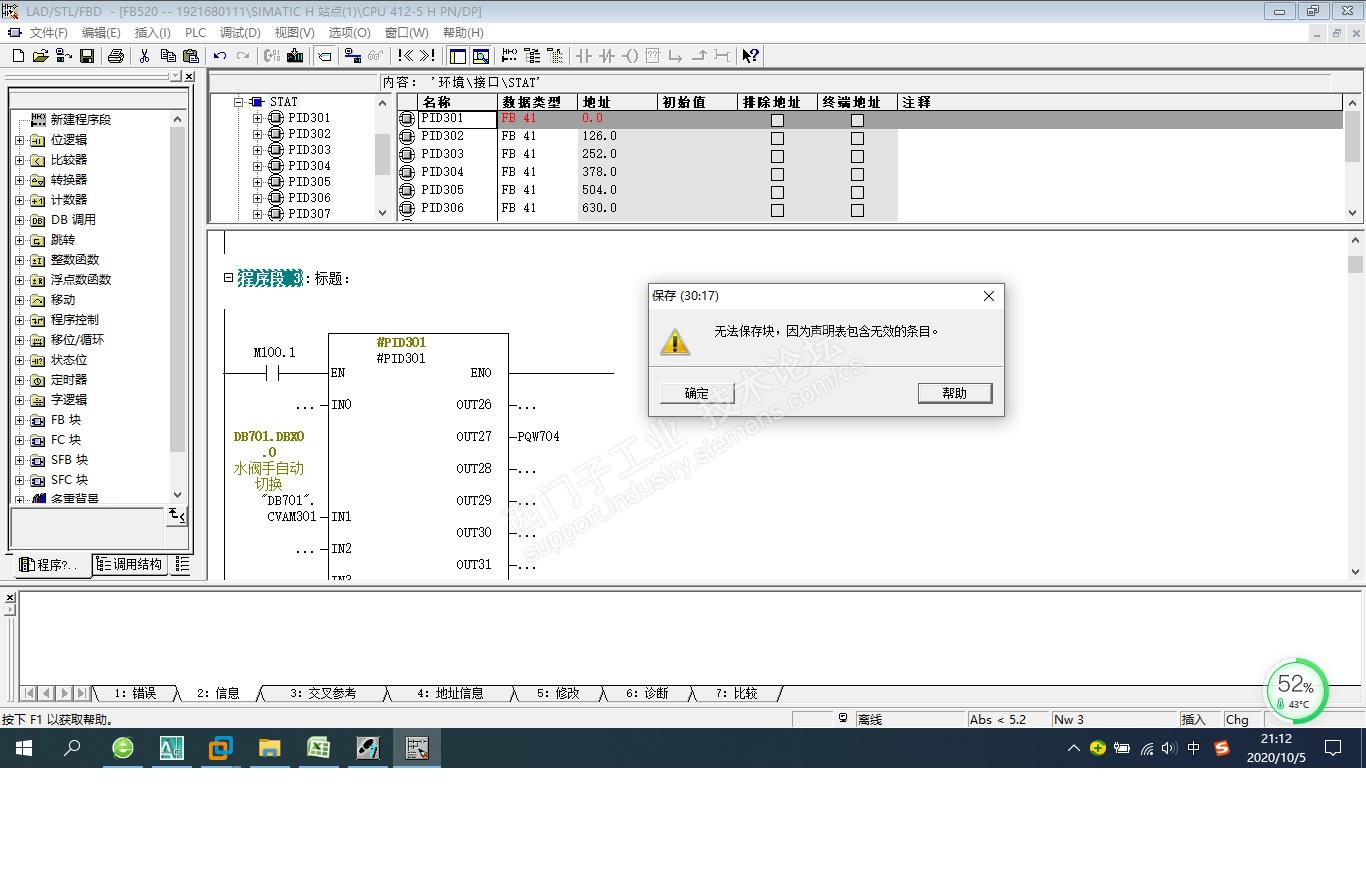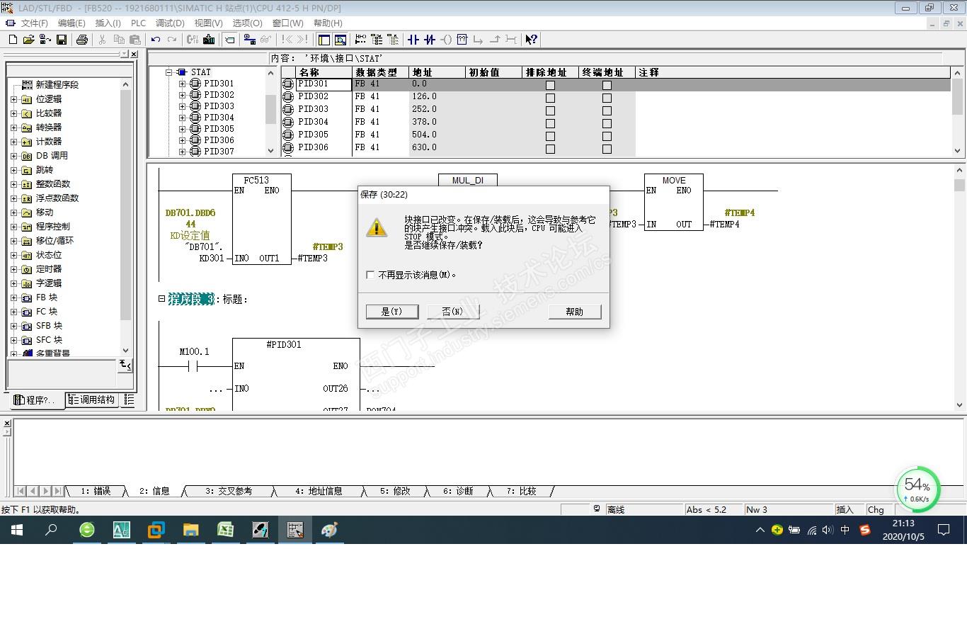 我预实现60个温度控制60个水阀,听从其他前辈建议采用多重背景数据方式减少DB块使用,但是在使用过来中稍微修改下东西就提示无法保存块,数据类型FB41报红色,我点击“检测和更新访问”,然后就可以保存了,但是提示“块接口已改变,下载会造成CPU停机”,请问各位前辈这个是我哪里出错了,为什么老是出现,等我真的在线的时候会不会真的造成冗余cpu停机,如何解决这个问题,万分感谢。