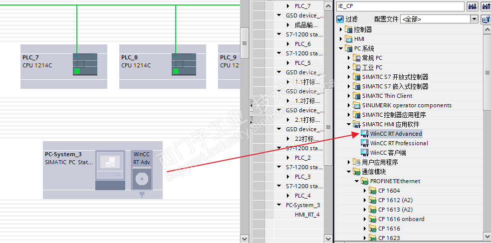 一,在右边的“硬件目录”下找到WinCC RT Advanced, 拉进左右的组态区域。如箭号所指