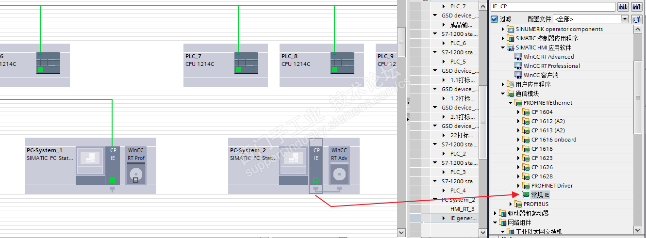 二,在右边的"硬件目录"的"通信模块"里找到"常规IE",拉进前一步的图形中央,如箭号所指。组态完毕。