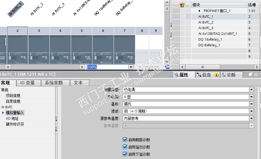 前几天遇到一个问题,第一次使用S7-1200的温控模块(SM1231 AI8XTC),编程好后,连上模块,在线监测温度模块的通道,当时模块上除了电源线都未接线,然后发现每个通道都有温度,多的有几千摄氏度,少的有几十摄氏度,而且温度还在变化。我就把通道都接上热电偶或者把通道都短接,诶,别说,温度显示就正常了,但是拆掉一路,该路的温度显示就不正常了。后来打电话问400客服,说是热电偶的工作原理是产生热电流的原因,模块内部检测,这是正常的现象。但是我们做工控的不能这么和客户说啊,他们就会认为,这个加热区我们热电偶还没接,就显示有200多摄氏度,或者高的达到400.500摄氏度,这个肯定不对,程序肯定哪里有问题。肯定会叫我们解决这个问题。然后我就在到处找资料,看看怎么弄啊。然后在组态软件里面找到了一个“断路检测”的选项。勾上之后,再测试,现在即使该模块通道不短接,温度也显示正常。短接后显示230,不断接显示的数值很大,而且很稳定。