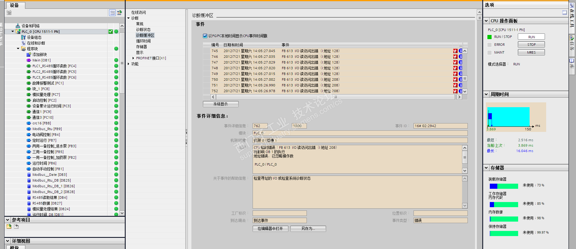 仪表接线,仪表通信地址各方面都检查了,就是找不到原因,最后监控程序时发现时不时PLC会报错如下:是这个原因读不到数据吗?(它不是经常报错);是组态的原因还是通信模块损坏了(现场环境确实不好,感觉温度过高,电线之类的东西容易生锈(橡胶厂污水处理站))。