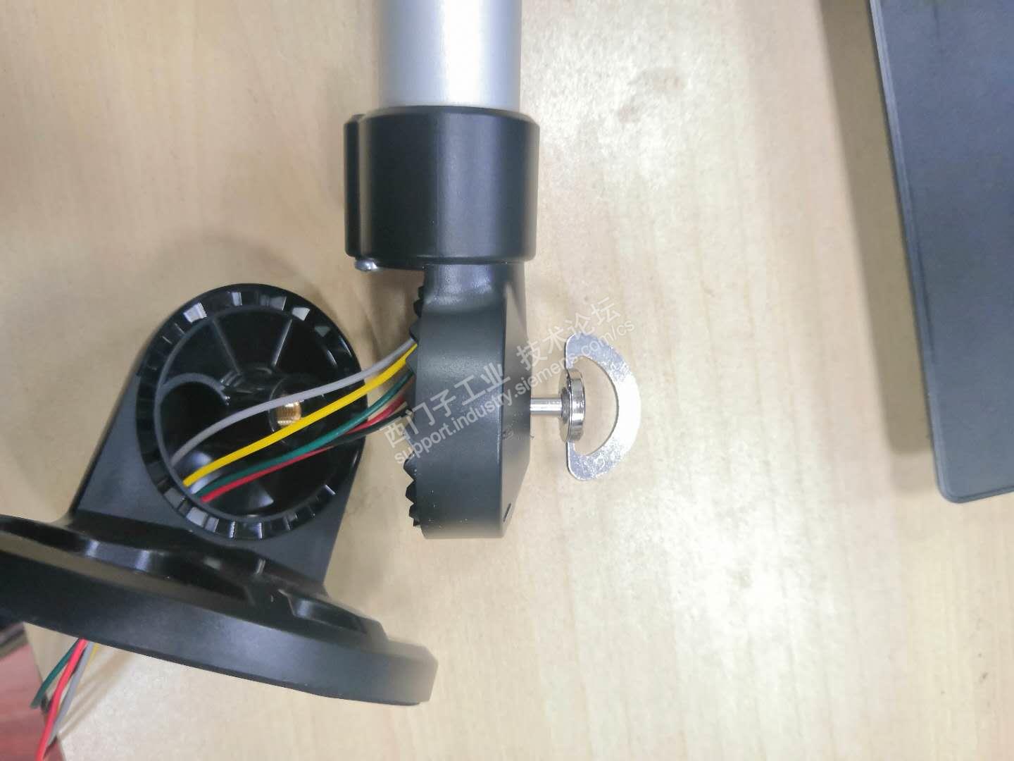 底座和常见的三色灯一样角度是可以调整的,但其设计的固定螺丝是有一个把手的,可以不需要工具就可以将其拆卸固定。方便了现场调整。再者灯柱预留的导线也是比较长的,方便了安装调试