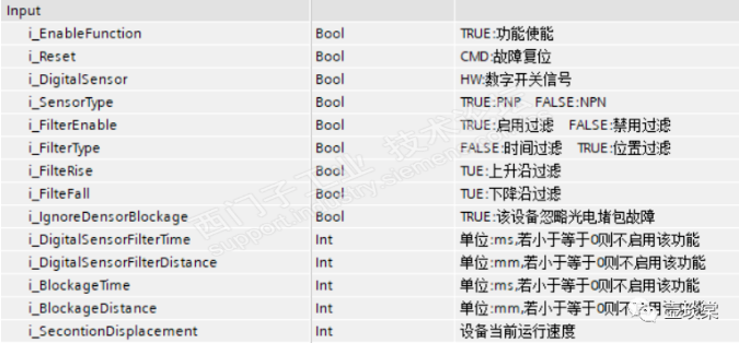 i_EnableFunction:该管脚为TRUE的时候使能整个功能块的功能,一般情况下都是满足自动模式以及设备已经运行进入自动逻辑后。若有工艺需要,也可以是其他满足工艺要求的逻辑。