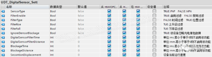 以上输入接口除了前三个以外,其他所有的输入接口都可以以参数设置的形式出现,比如在程序中建立一个UDT_DigitalSensor_Sett的数据类型,程序中凡是涉及传感器的程序,都可以集中配置。同时,以上的输入接口也可以做成前三个+配置UDT的接口,这样整个程序的输入接口在视觉效果上就会干净整洁很多。
