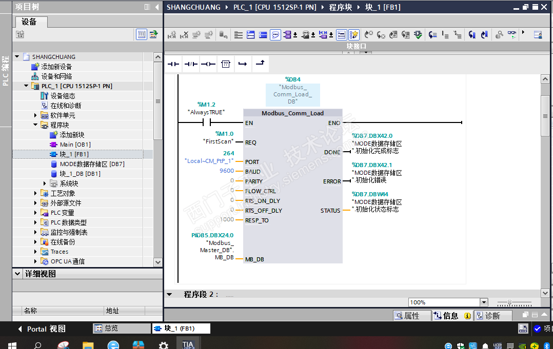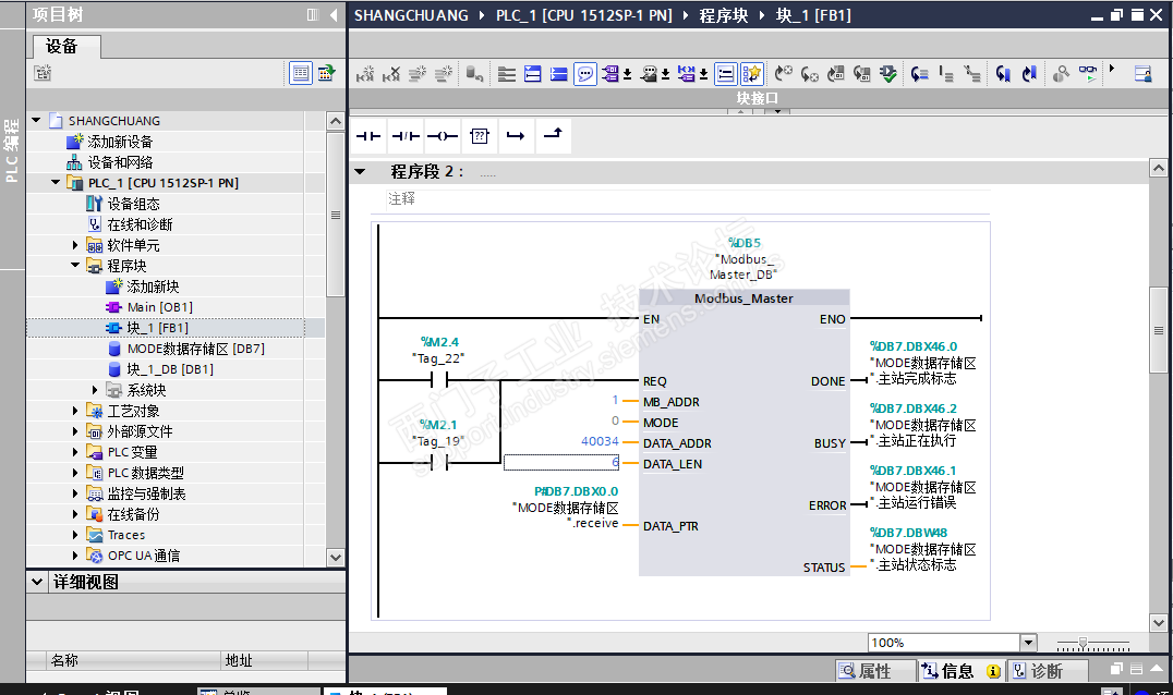 如图,我写了一个关于和风速测速仪通讯的程序,但是运行时MODBUSMASTER error报错,done也没有被置位过。请问我的地址写的正确与否,本人比较怀疑地址的问题,我写的是40034,(40001+21H),因为厂家的读寄存器地址是十六进制的21H,我就想上起始地址。好像这样写不对,另外LEN长度能不能写成6?请高手指导一下。