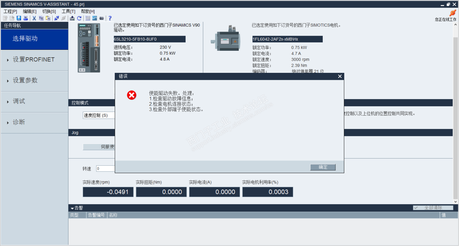 1500控制V90不能使能电机,使能后报错8001,组态没有错误,工艺轴也没有报错,驱动器上也没有报错,SINAMICS V-ASSISTANT上也不能使能电机,检查了接线也没有错误。不知道为什么会出现驱动错误不能使能,求知道的大哥帮忙解决,感激不尽!