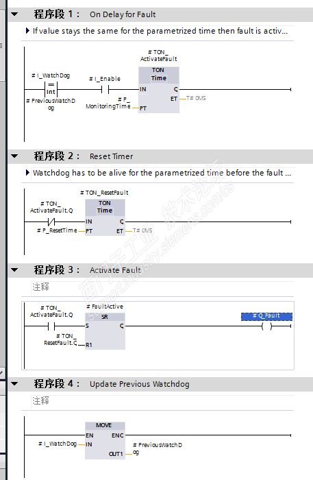 编写一个看门狗FB,使用一个int不断的扫描周期++1 (递增1)不断的进行两个周期的结果判断,如果==等于时说明数据没有更新,大于多少时间时说明通信已经中断。
