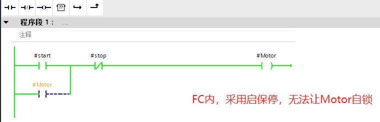 补充问题回答:你在FC块中用置位和复位指令没有,你都看到结果了。必须你start一致接通才能算是给motor赋值,这样motor才能有输出。