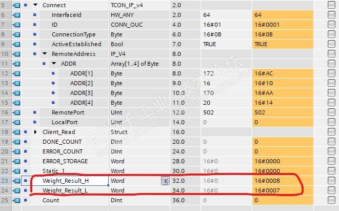 最后给出数据,对应的DB块内,可以看到数据已经读上来了,如上图