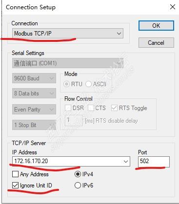 设置Connection和IP地址,这里要选择忽略ID,不然通讯不上