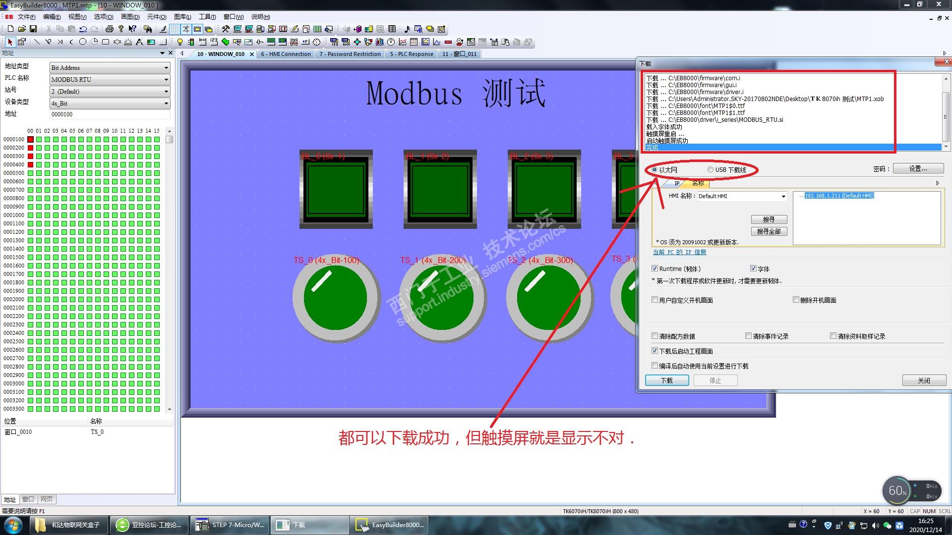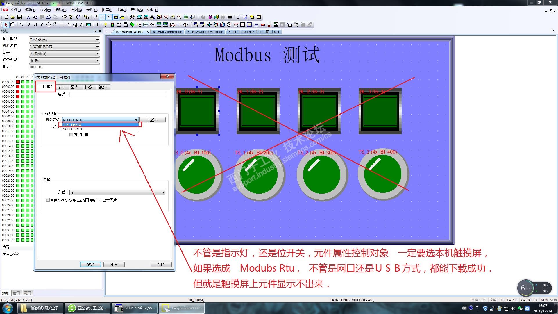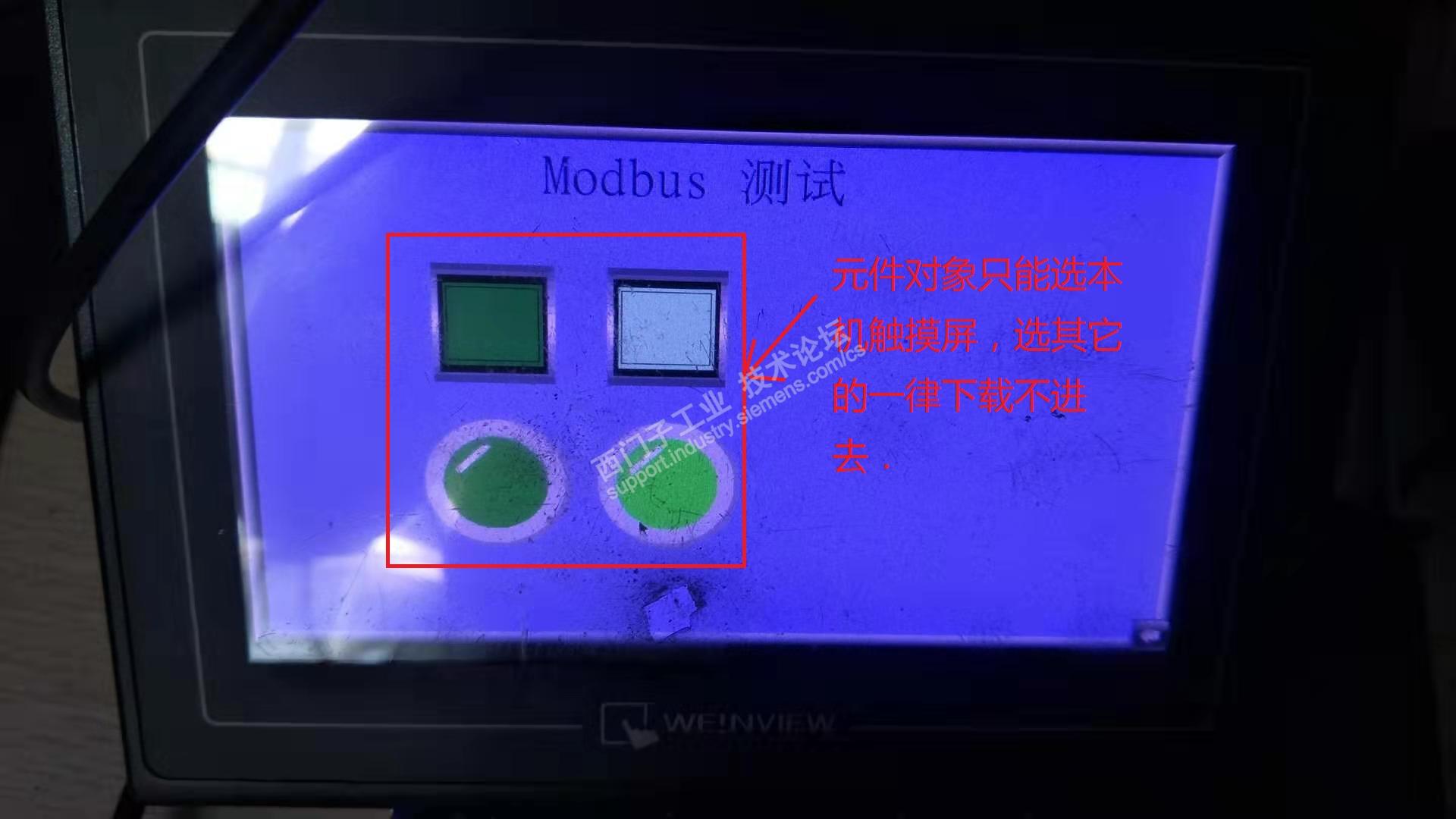 请教各位大神指点!第一次搞触摸屏,为什么文字可以下载进去,元件选本机触摸屏也可以下载进去,但如果元件控制对象选外部PLC 死活就不行.