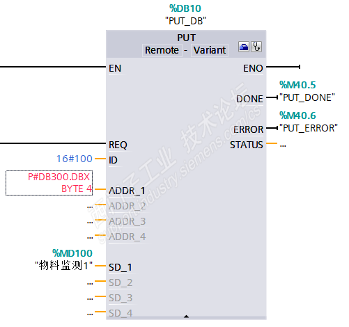 S7-1200与SMART进行单边通信,我想让1200读取的模拟量输入值传送到SMART中,比如1200这边读取到的模拟量地址为VD300,SMART那边接受地址为VD304,如何在PUT中写ADD的地址呢?看说明书是说这个PIN是服务器端的接收地址指针,不太懂?