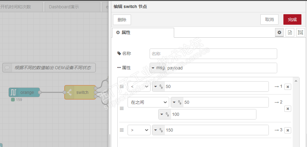 如果不想浪费宝贵的账户余额,我们还需要给Twilio节点设置一个触发条件,建议采用switch节点。我这边设置的是50以下为设备低压状态、50-150为设备正常状态、150以上为设备报警状态,此时才会触发SMS短信提醒功能。