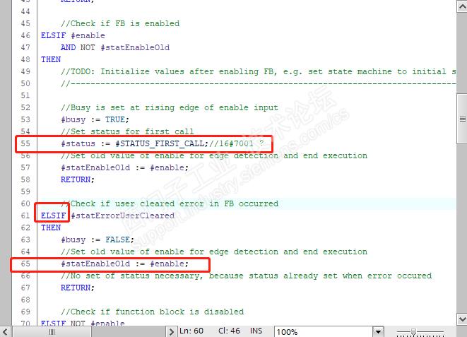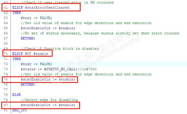 然后第61行这里ELSIF指令没有写 ELSIF #enable AND NOT #statEnableOld 或者 ELSIF NOT #enable AND #statEnableOld,那么就和65行构成不了上升沿下降沿了呀,那65行的程序有什么意义呀?
