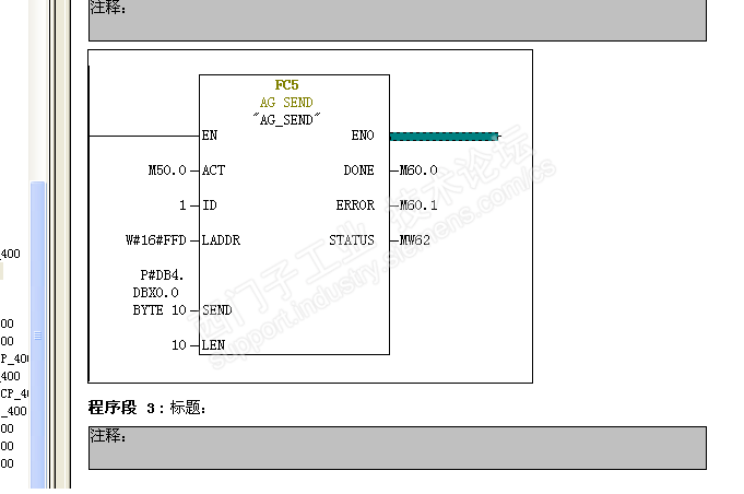 2. 分别打开两个项目的编辑通讯程序功能块FC。在shiyan1项目程序段中调用系统功能块<AG_SEND>发送块,在shiyan1项目程序段中调用系统功能块<AG_RECV>接收块。