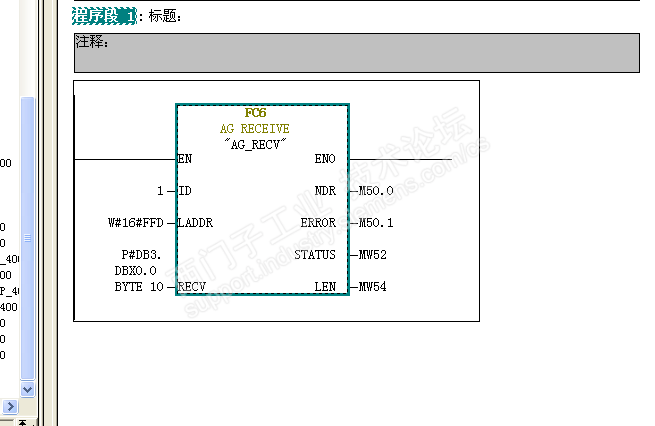 4. <AG_RECV>接收块管脚解释:<ID>根据组态连接标识号,具体输入可参见网络组态对话框<属性-ISO_on_TCP连接>中的块参数;<LADDR>具体输入可参见网络组态对话框<属性-ISO_on_TCP连接>中的块参数;<RECV>带接收数据的缓冲区;<NDR>为0表示作业还未启动或仍然处于激活状态,为1表示作业已成功完成;<ERROR>通讯出错;<STATUS>错误代码; <LEN>用于接收数据的长度信息。