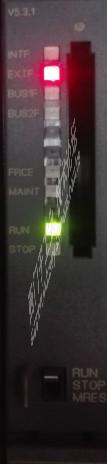 1. 自动化维护人员观察CPU模块指示灯状态。确认CPU模块所处状态。(1)、<INTF>灯亮,代表内部故障,例如用户程序运行超时,用户程序错误等都会引起。(2)、<EXTF>灯亮,代表外部故障,例如电源故障,I/O模块故障等。(3)、<FRCE>灯亮,代表至少有一个I/O信号被强制。(4)、<BUSF>灯亮,代表PROFIBUS-DP总线故障。(5)、<RUN>亮,代表CPU运行状态。(6)、<STOP>灯亮,代表CPU停止状态。