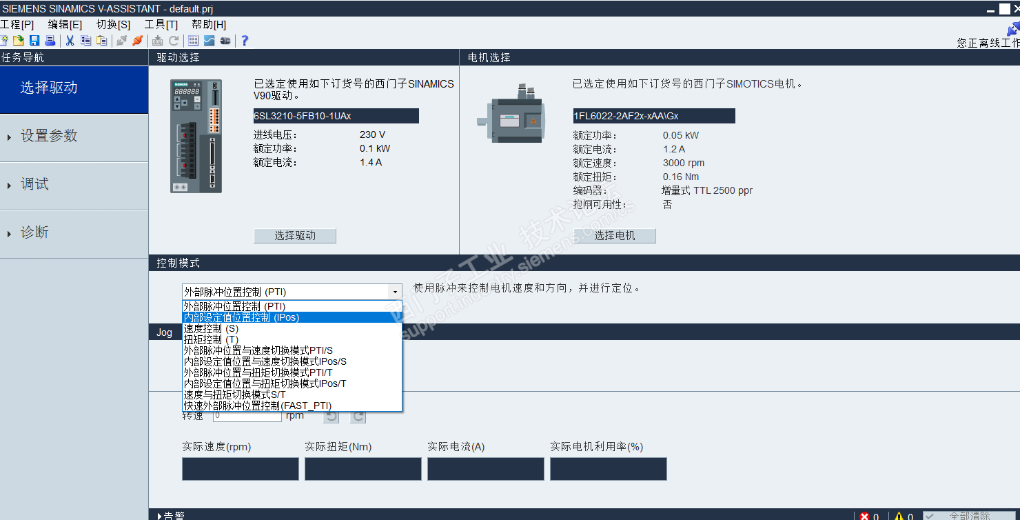 选择IPOS控制(V90PTI)或基本定位(V90PN)