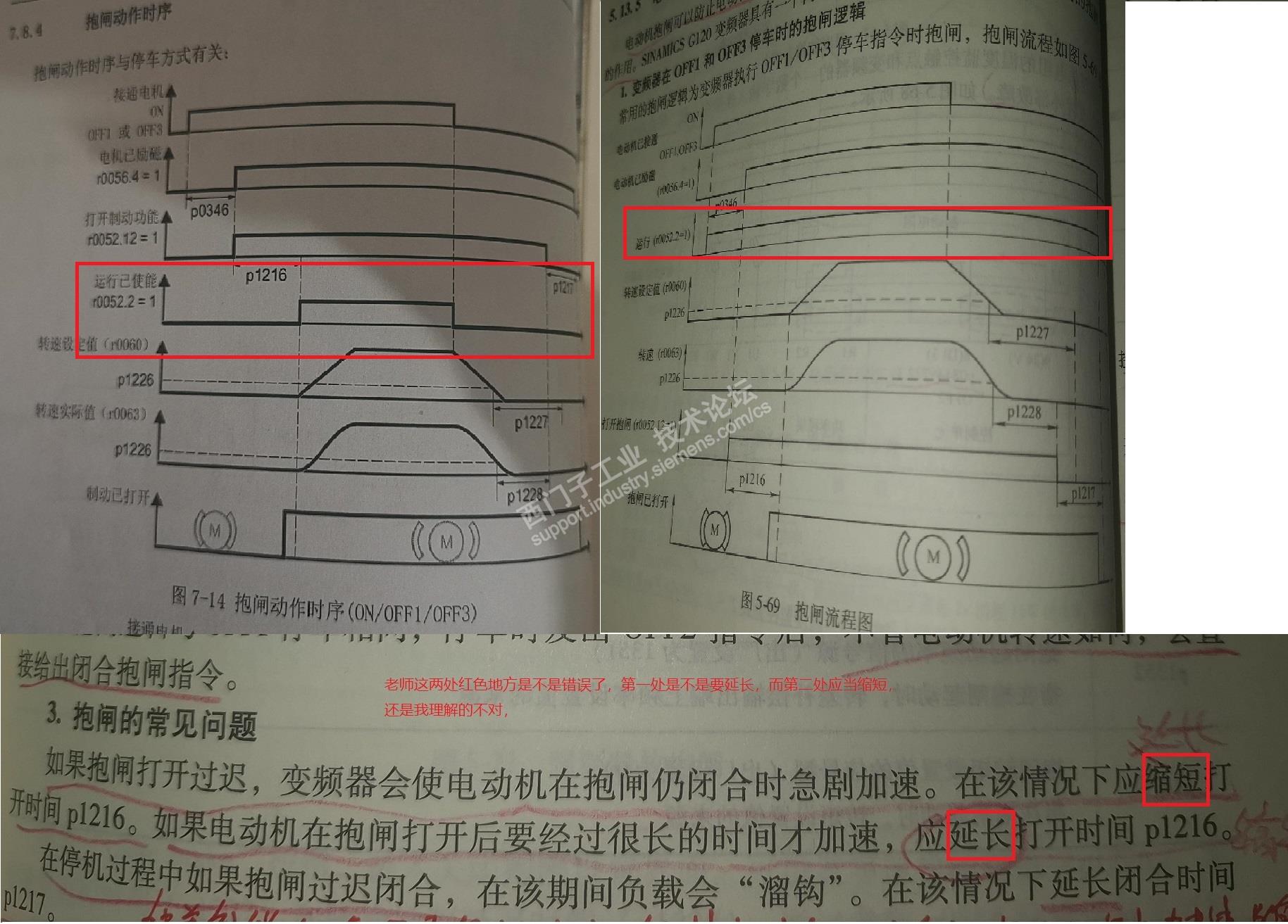 这两本书的抱闸时序表,红框内为什么不一致,都是西门子的教材和资料。