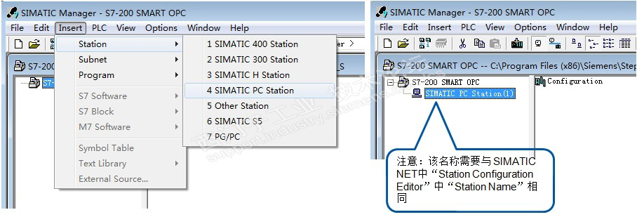 1、在 STEP7 中新建项目,组态 PC Station。打开 STEP7 并新建一个项目:“S7-200 SMART OPC”,通过“Insert”>“Station”>“SIMATIC PC Station”插入一个PC站,PC站的名字为:“SIMATIC PC Station(1)”。注意:STEP7 中 PC Station 的名字“SIMATIC PC Station(1)”要与 SIMATIC NET 中“站组态编辑器”的“站名”相同。