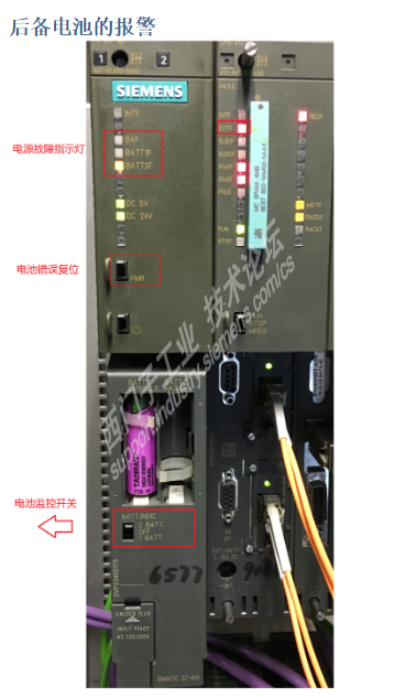在系统投入一段时间之后,巡检时发现400cpu的电源模块上的BATT1或BATT2指示灯黄色常亮,BAF指示灯红色常亮,并且CPU的EXTF指示灯亮,通过查找资料得知是后备电池电量不足,需要进行更换。在不确认是否是电池电量低还是钝化的情况下,取出后备电池用万用表测量了一下电池的电压,发现低于3.6V,由此确认是后备电池的问题。