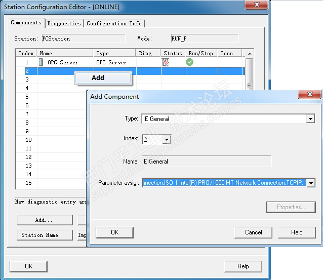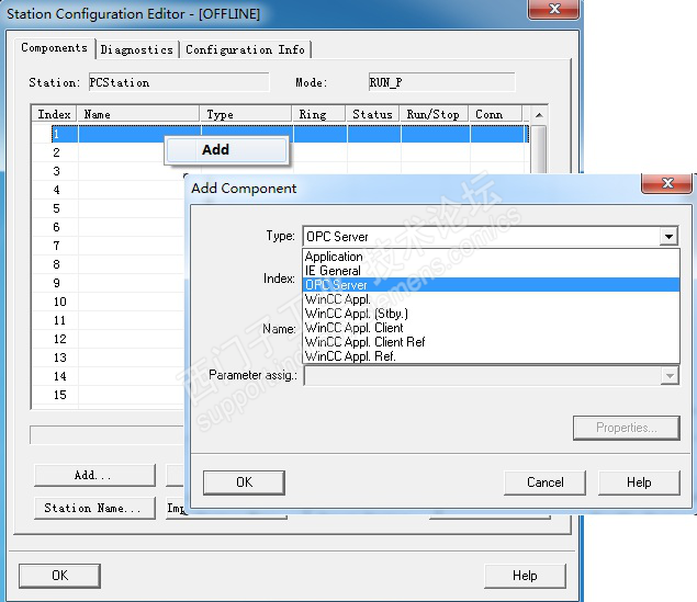 2、 添加 OPC Server。选择第一号插槽,鼠标右键,选择"Add",在弹出的添加组件窗口中选择 OPC Server。如图下图所示。