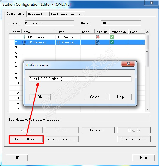 5、命名 PC Station。PC Station 添加完 “OPC Server”和“IE General”组件后,需要命名 PC Station,该名字需要与 STEP 7 硬件组态中的“SIMATIC PC Station(1)”的名字一致,如图下图所示。